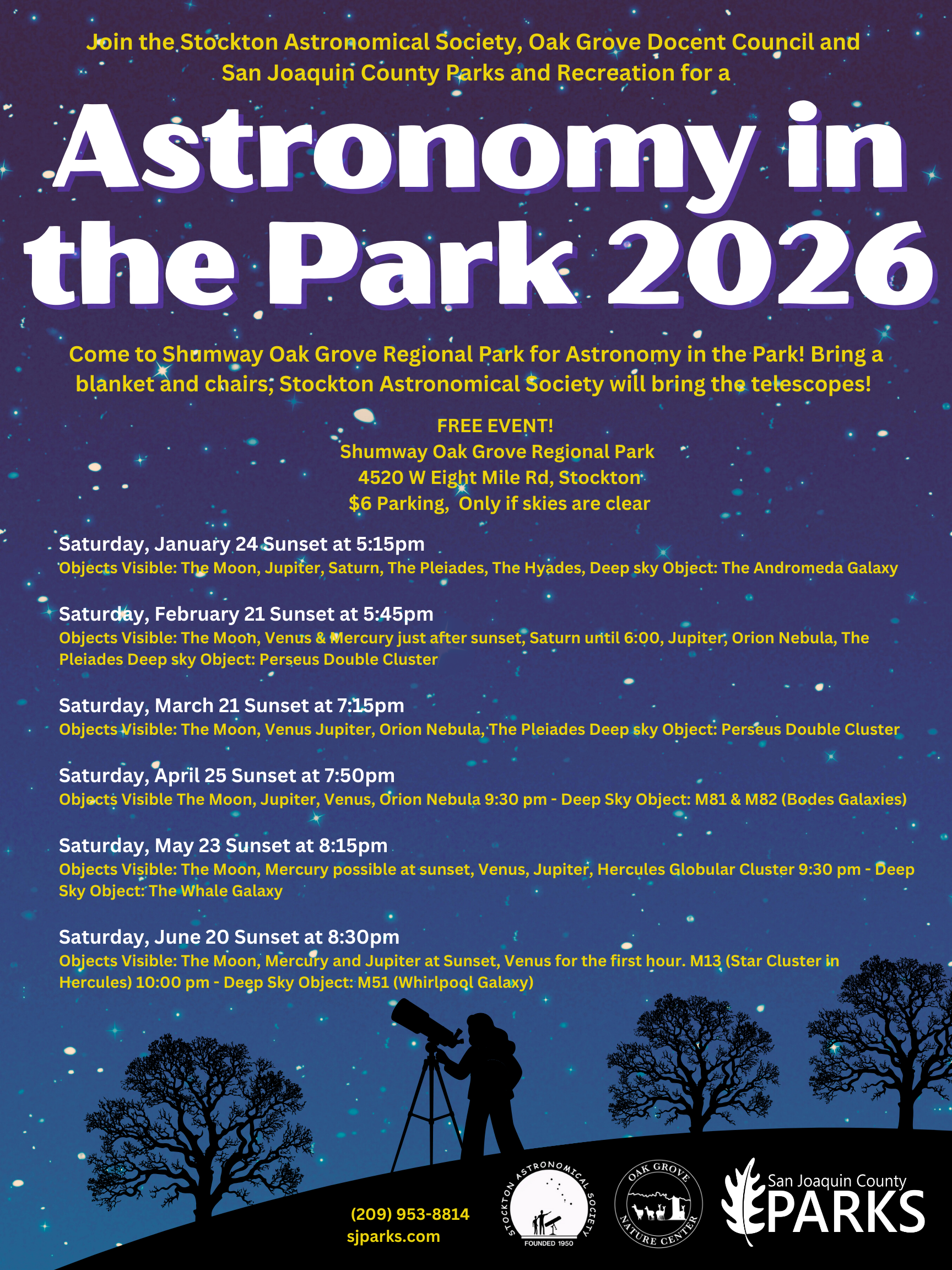 Come explore the planets and stars at the first Astronomy in the Park event of the year! Join us at Shumway Oak Grove Nature Center at 3 PM for a special talk by longtime Stockton Astronomical Society member and Nature Center Docent, Douglas Christensen, titled “What Can You See in the Night Sky Without a Telescope?”. The Nature Center will remain open until the start of Astronomy in the Park at 5:15 PM, feel free to arrive early and enjoy fun, space-themed activities and crafts. These include astronomy word games, coloring pages and even making your own toilet-paper-tube constellation telescope! Free event, $6 cash parking fee. Hours and viewable planets will vary.
